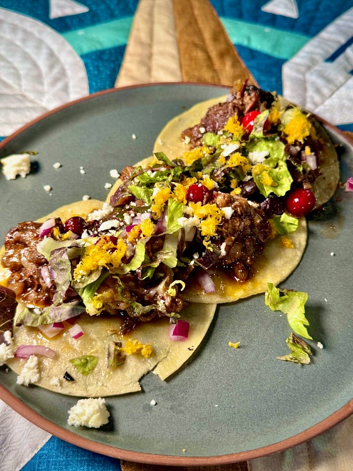 Service Suggestions: These hot and tangy beef cheeks are very versatile and can be used in may different presentations. For this collaboration, we presented ours three ways: 1) atop risotto 2) as tacos with romaine, cotija cheese and grapefruit zest 3) on an arepa. You can also use them for nachos, sandwiches or on their own as a fun replacement for turkey haters this thanksgiving.