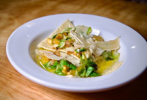 • Mushroom ravioli with Brussels Sprouts leaves and butternut squash in brown butter, a dish with which he won one of his greatest culinary competitions at the Taste of St. Louis.