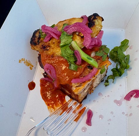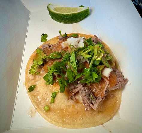 • a lambacoa taco: maybe my favorite bite; it’s basically lamb birria, laced with clove essence in the aftertaste. Trancoso says he steams it versus braising it, like it’s done in his hometown of Aguas Calientes, Mexico.