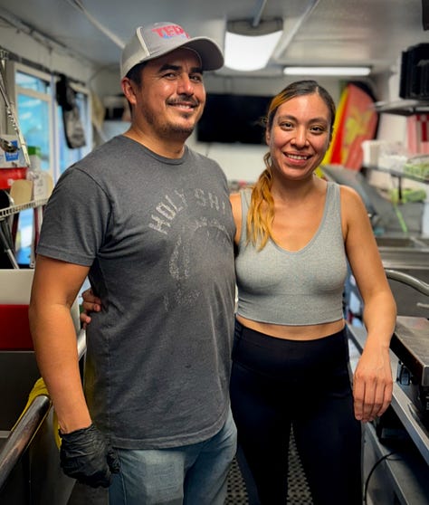 Trancoso and his partner/co-owner Princess Deleon invite me and my former CS Indy colleague and fellow food writer Bryce Crawford (who’s in-town for work) onto the truck to hang out as they cook for us. It gets us out of the aggressive wind that day and allows me to better meet Deleon, who tells us she grew up on a food truck. Specifically her father’s, a local forebearer to today’s prolific food truck scene, named Tacos Yuyin. She says he made it fun for her, and she learned a good work ethic; her favorite dish was his carne asada, which she says he did differently than others.