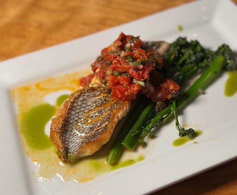 • Seared branzino with sautéed broccolini and Puttanesca relish, inspired by his favorite item at Favazza’s on the St. Louis Hill, where he began his career.