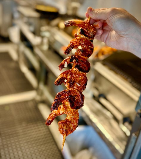 • a skewer of shrimp Zarandeados: juicy and slathered in a Guajillo sauce, mildly spicy and faintly smoky, simple and delicious.