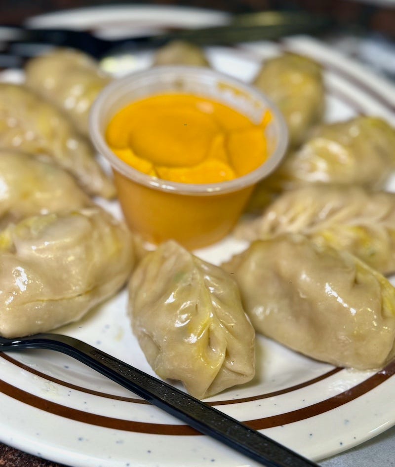 Lastly on our family-style spread, we’ve ordered a plate of vegetable mono, steamed. They’re essentially potstickers, or you wouldn’t be misunderstood to call them dumplings, just differently shaped. Here, the soft, tacky dough is pinched into braids along a top crest, like a steep mountain ridge. The filling is standard-good and the highlight is the warmed, tart-spicy vegetable dip served with it, made with cucumber, tomato, jalapeño and garlic, we’re told.