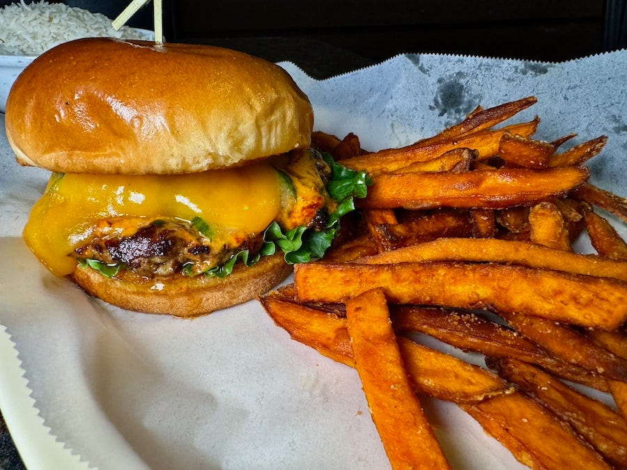 The lamb tikka masala burger, ordered hot, delivers a welcome spicy kick that never overwhelms, again bringing terrific Indian tastes to America’s most ubiquitous protein between two bread slices. The only downside is that the whole saucy affair sogs fairly quickly resulting in an overall mushy texture. (Thinking of you Dionne with your “I don’t do wet bread” comment from years past that I’ll always remember.) Still, I think you should try the burger for its unique factor. It comes with a side option for $18; we choose sweet potato fries for $1 more, crispy and well prepared.