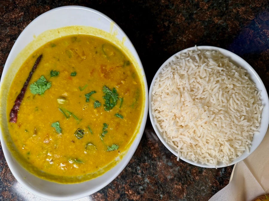 Our Daal Tadka, ordered medium, delivers the simple joy we want in a light lentil dish to balance the heavier items on the table. One whole chile pepper spikes the thick stew, floating on top next to chopped cilantro as bits of tomato chunk peek through the brownish-yellow mud. We mop it up with rice and pieces of honey naan, which is exactly what it sounds like: naan covered in honey, like it wants to be a sopaipilla. We ordered it wondering if it would be honey incorporated into the dough, but don’t entirely regret the decision because, well, honey. I wouldn’t normally reach for it with a starchy bean dish, but I have no reason to complain in the moment.