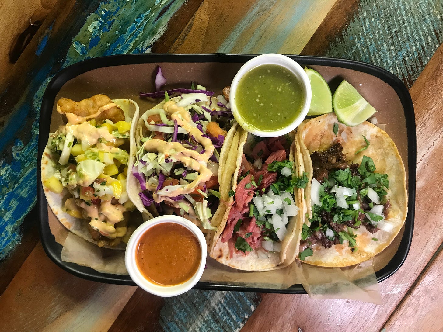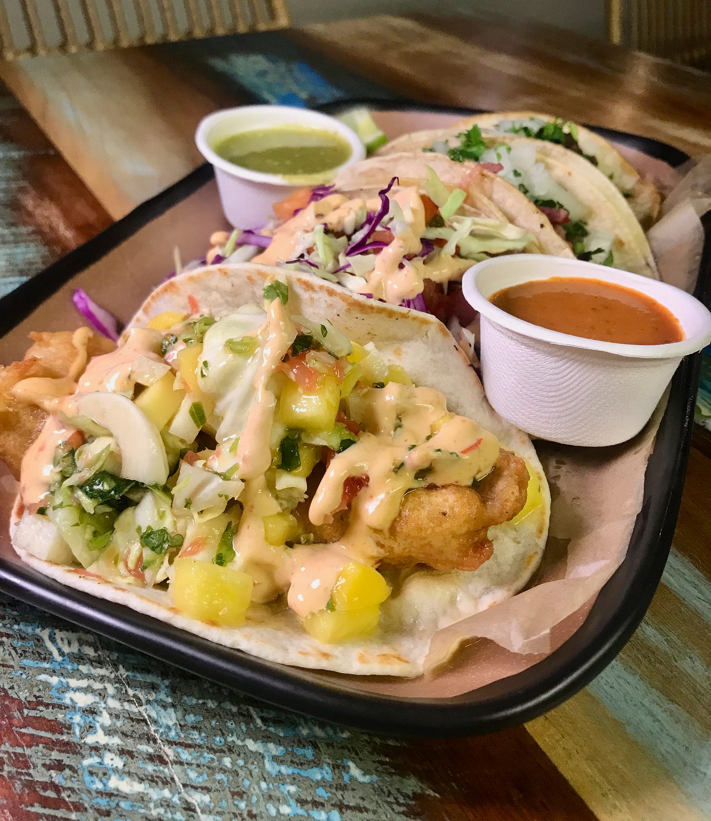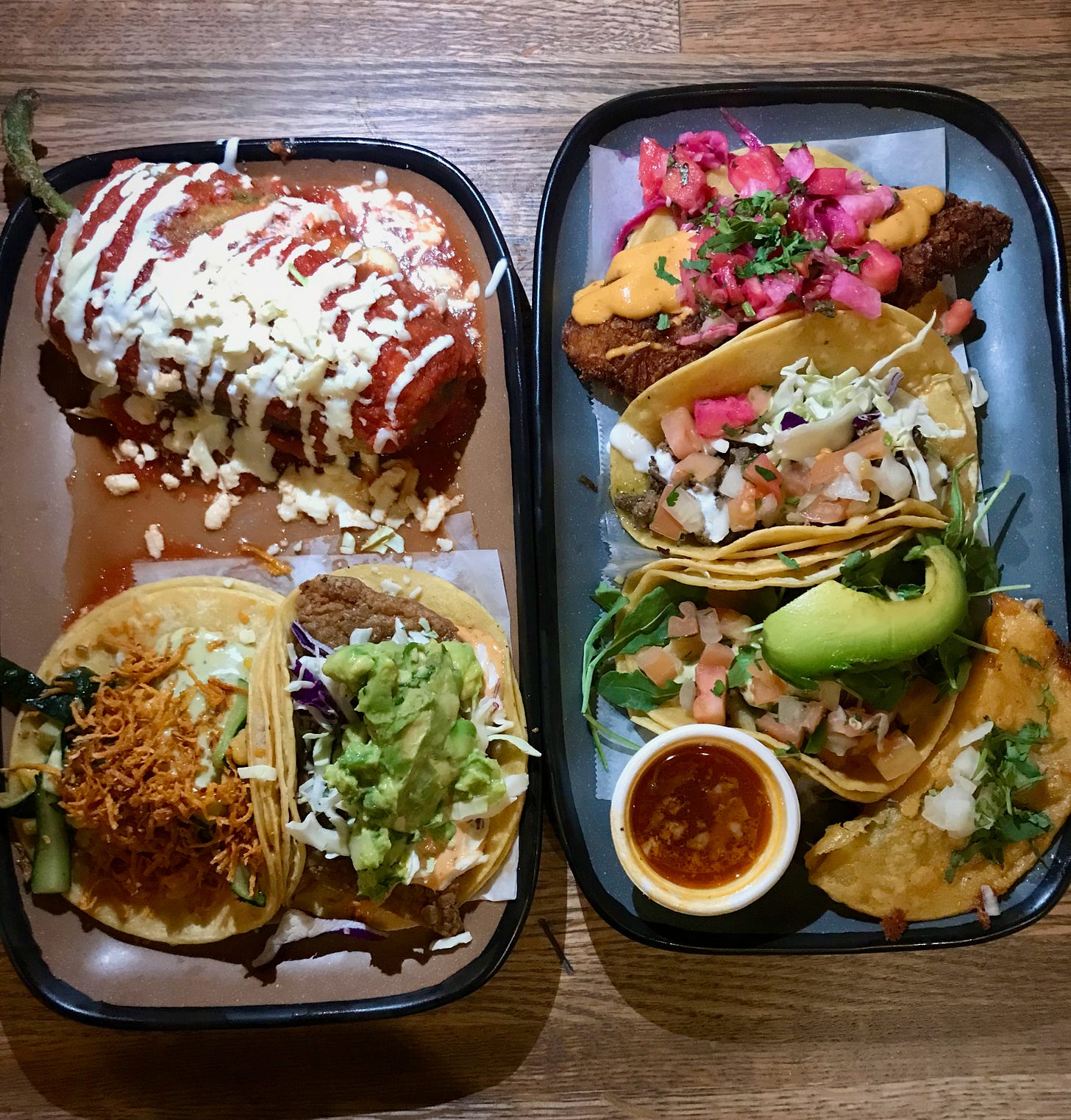 Lindsey designed the place, inspired by the town of Tulum on the Yucatán Peninsula. There’s thatched overhead fixtures, fiber art, Mexican-print throw pillows on booth seats, colorfully painted tables, and completing the somewhat beach-y vibe: swing seats in the front window for diners wanting a little movement with their meal. Initially, service was conceived as counter-style, with orders taken at a vintage VW bus parked in the restaurant’s rear, with a giant, lit TACOS sign atop it. Early rushes proved that model wasn’t ideal, with lines spanning outside and partly down the block, so the family quickly adapted to provide table service.