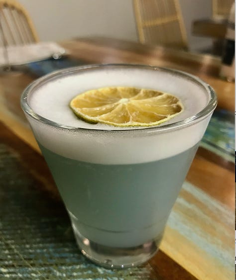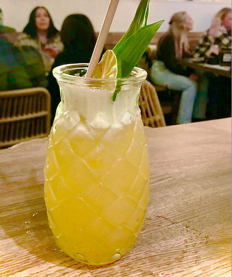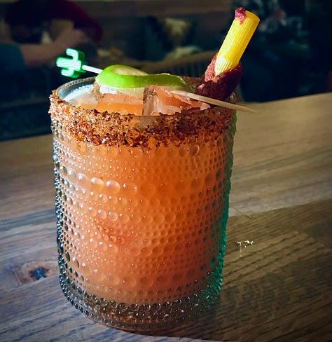 But for new-to-us drinks, we this time pick the Mangoneada, Tiki Tequila and Mexican Blood & Sand. The first is based on the beloved slushie drink made with mangoes and chamoy (commercial pickled chile and fruit sauce) with a Tajín rimmed glass. Here it gets boozy with tequila added, plus lime and serrano pepper for more heat joining the sour-sweet-spicy affair, and the mouth-puckering tamarind candy straw that’s included sends it.