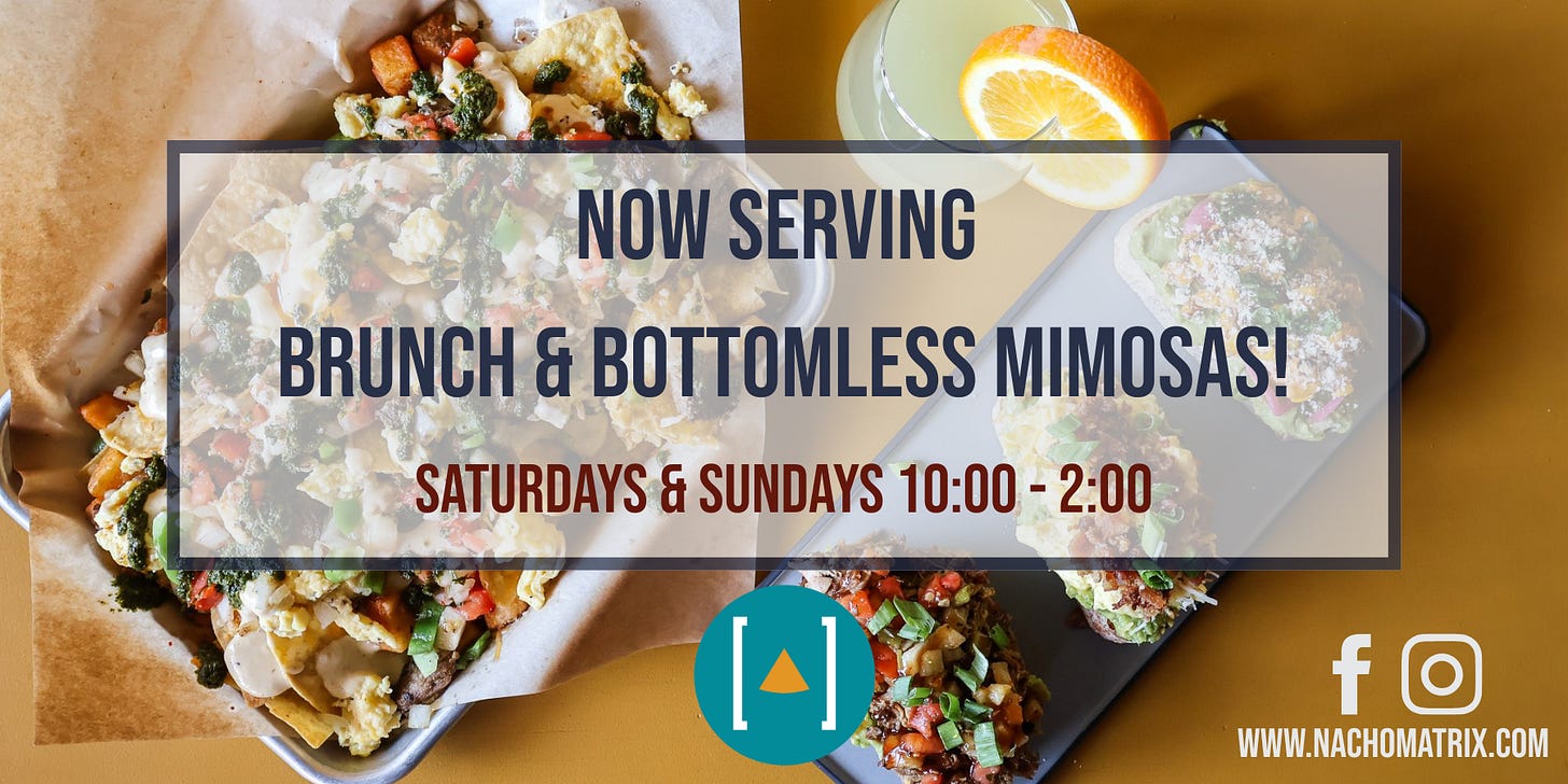 Nacho Matrix: Come see us for brunch, 10 a.m. to 2 p.m., Saturdays and Sundays, where you’ll find items like elote chilaquiles, steak & egg nachos, our vegan breakfast burrito and tres leches french toast. Start or finish with strawberry cheesecake churro bites. Pair your meal with a bottomless mimosa or espresso martini.