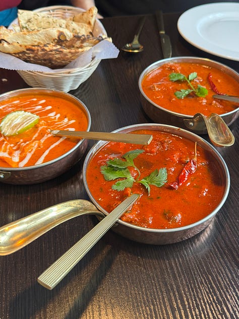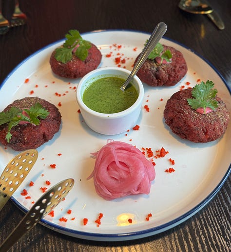 From an Indo-Chinese starters list we nab a plate of Beetroot Tikki that are like the beet equivalent of falafel, fried crispy with zesty seasonings and served with a mint chutney sauce for dipping. We also share Lamb Rogan Josh, Lamb Vindaloo, Smoked Dal Makhani and Mango-Lime Chicken with sides of rosemary, mint-basil and truffle-Parmesan naan breads.