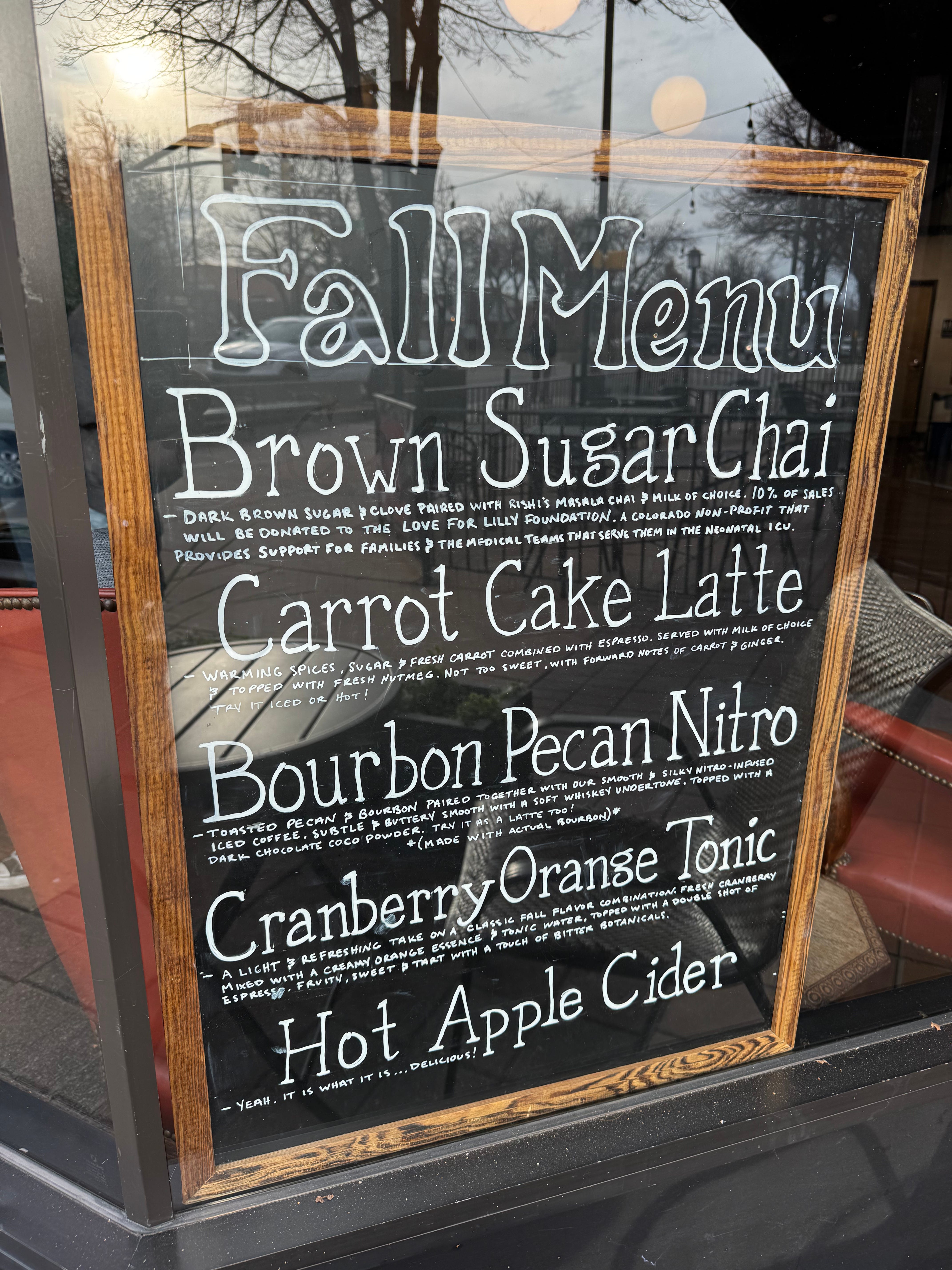 Before we take off back to the Springs, we stop by my favorite Fort Collins coffee spot (and arguably its best), Harbinger, to fill our to-go mugs for the drive. From the seasonal specialties menu displayed on a chalkboard in the window we can’t resist the Carrot Cake Latte (hot) and Bourbon Pecan Nitro Latte (cold).