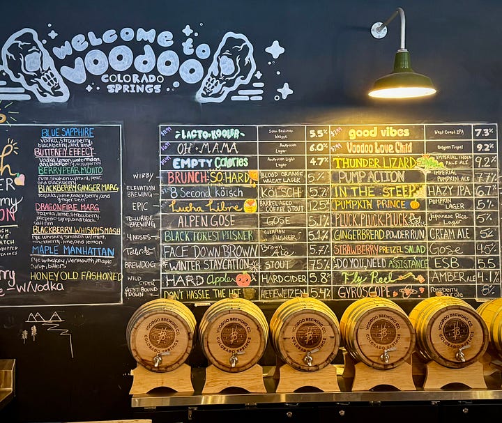 • The Colorado Springs Voodoo Brewing Co. has made some recent changes that are a “pivot into the needs of our customers” in the words of owner Micah Maffeo. I stopped by last week to catch up with him briefly and enjoy a taster paddle of brews. (They have a respectable guest-tap list on at the moment with some fun seasonal flavors like a gingerbread cream ale, pumpkin lager and winter stout.) Maffeo says the biggest improvement they’ve launched is table service: “For anyone who wrote us a bad review online complaining about having to order at the bar, we got you,” he says.