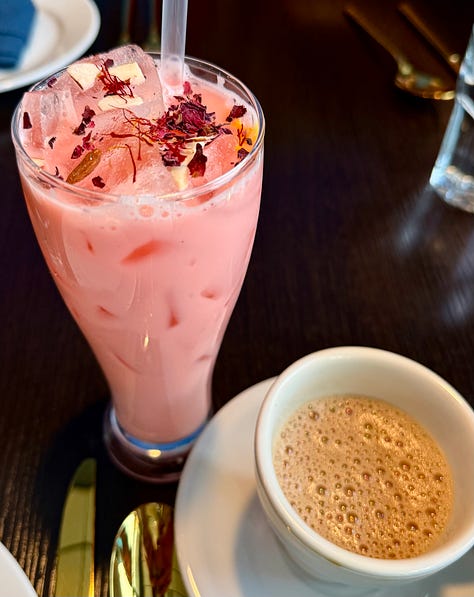 The smoke element on the black lentils was also nice, and they ate better than most renditions around. The Mango-Lime Chicken proved the sleeper hit, though, harboring faintly sweet honey notes and eating more like a typical butter chicken, rich and creamy. I also nab a hot chai to sip on and a worthwhile mocktail (the full ingredients of which I neglected to document and can’t find online), made with rose-infused almond milk and garnished with dried flower crumbles and shaved almonds.