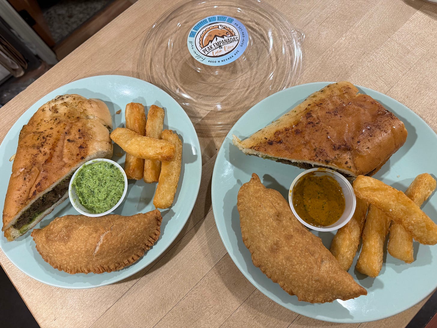 We find the Peak Empanadas food truck at its prior spot on 4650 N. Nevada Ave., outside the now-defunct Señor Manuel’s Restaurant. They’ve since moved to regular service at Golden Hills Park off of Delmonico Drive — 3:30-6:30 p.m., Thursdays-Fridays, and noon to 5 p.m., Saturdays — but make sure to check their Facebook page for the latest updates before you venture for them.