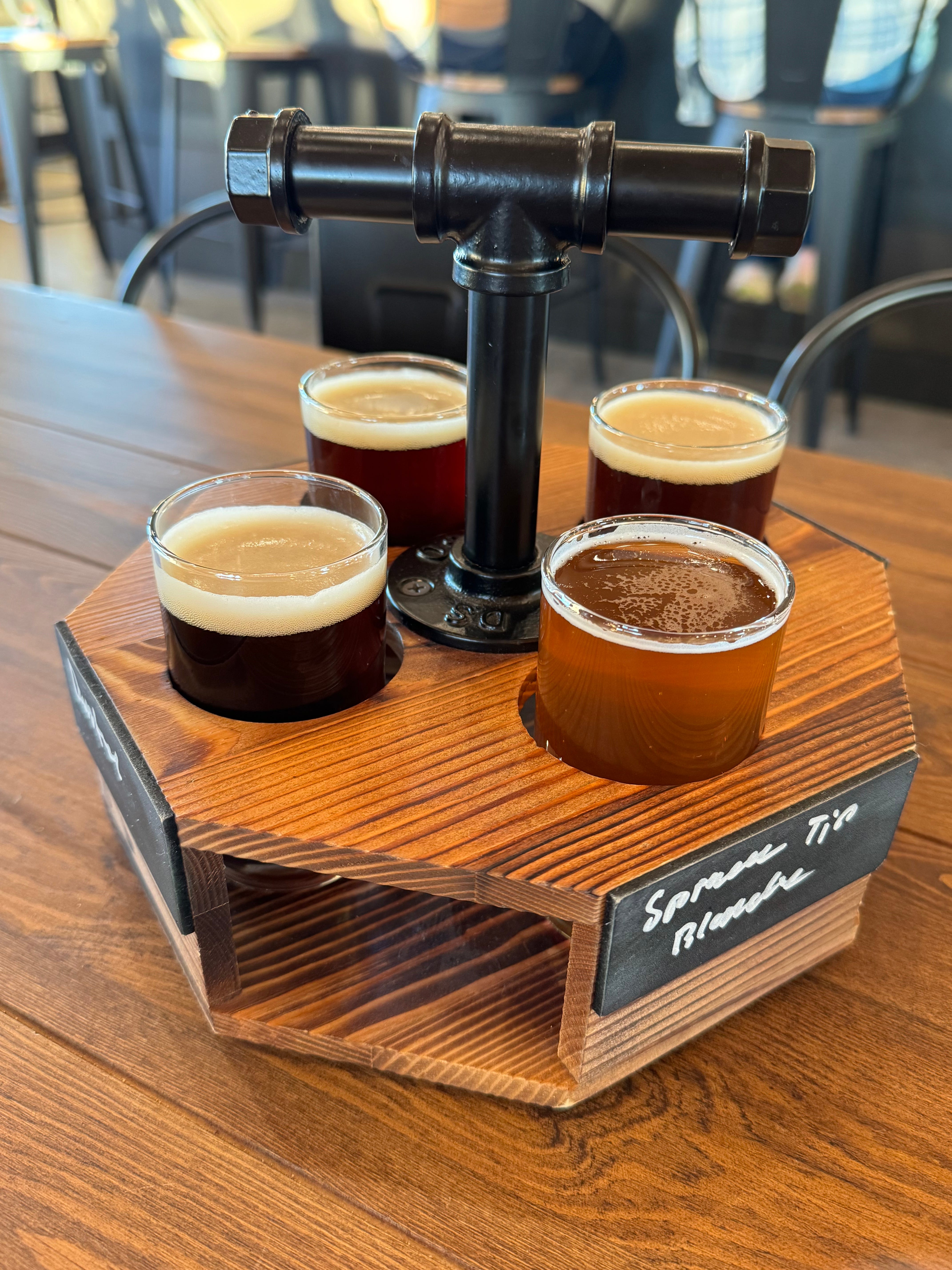 The taproom hosts 12 taps and the day we’re in they’re trying to run through what product is on hand before the long holiday break, so selections are a bit more limited. We grab a tasting paddle with a Christmas Ale, a Spruce Tip Blonde, an English IPA and a Dunkle, spanning a good range of styles. Our beertender says they tend to rotate regularly through New and Old World beers.