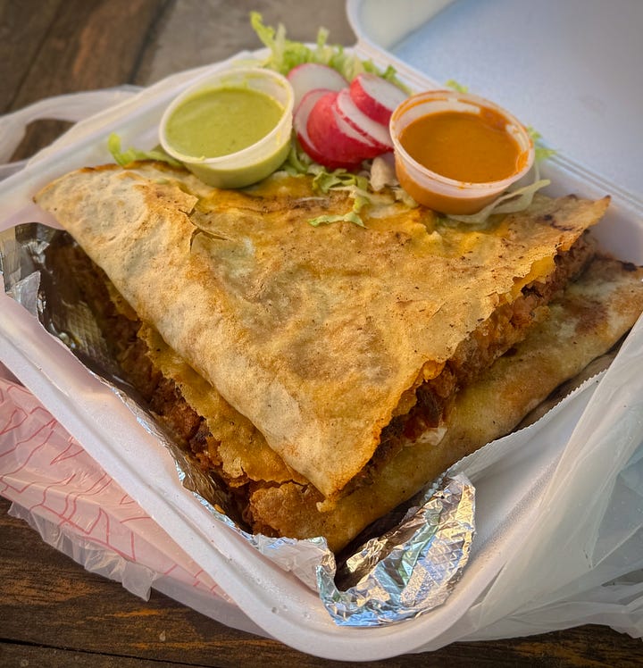 Tlayudas hail from Oaxacan cuisine and also feature a crispy tortilla, and are often served open-face, too. But at Maru’s, likely because it needs to fit in a standard to-go box, they serve it folded over. You choose asada, barbacoa or pastor (of which I ask for a mix of the latter two) and that joins chorizo, refried beans and Oaxaca cheese as filling.