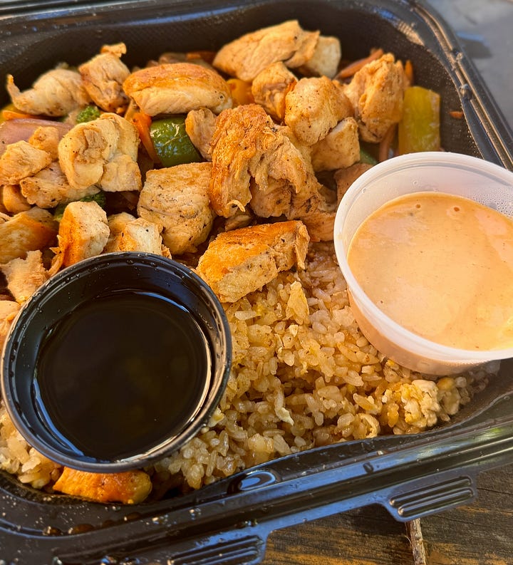 I ask for a chef’s choice, and he makes me the chicken teppanyaki with a full vegetable mix of bell peppers, onions, mushrooms, carrots and zucchini. This is the signature dish he launched the truck around, he says, though guests can also choose proteins of steak, shrimp, spam or just vegetables.