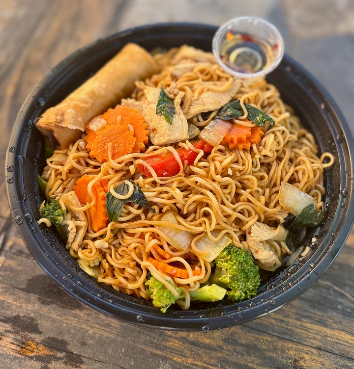 She’s keeping her menu small and flexible for now, as she’s currently only serving three days a week during lunch (early to mid afternoon) here. What that looks like this day: Thai fried rice, Panang curry or drunken noodles with chicken or Pad Kra-prao with ground pork. There’s also side veggie spring rolls available, but Thai-style fried chicken is already sold out by the time I arrive.