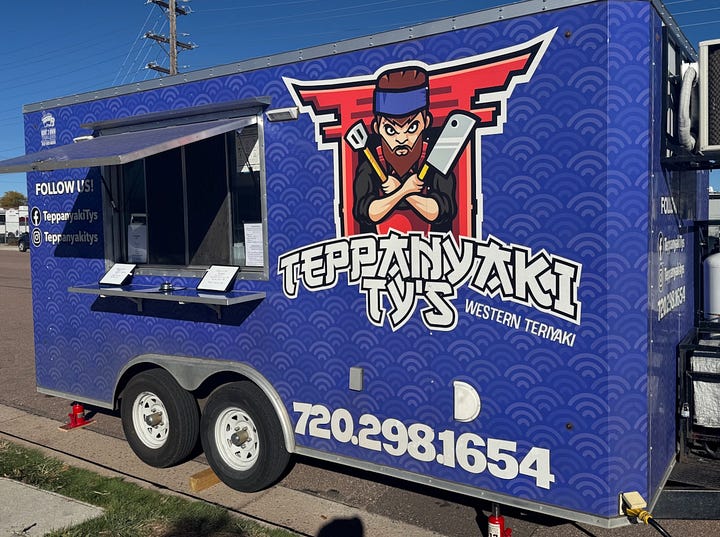 I find three trucks lined up at an office park off Platte Avenue: Bangkok Bites, Teppanyaki Ty's and Maru's Mexican Food