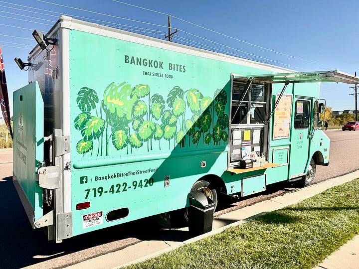 On a recent Friday I find three food trucks lined up on Wooten Road, just off Platte Avenue toward Town Center Drive. The first is Bangkok Bites, which just launched in late August of this year.