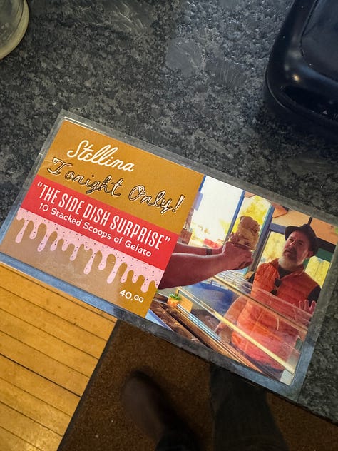 Nobody ended up ordering the 10-scoop Side Dish Surprise gelato. Boo — where are my thrill-seekers?! And we totally forgot to auction off Ava’s amazing portrait of me — which everyone says makes me look like a Hasidic dude, haha! (She was going to give the proceeds to the staff as a tip — sweet!)