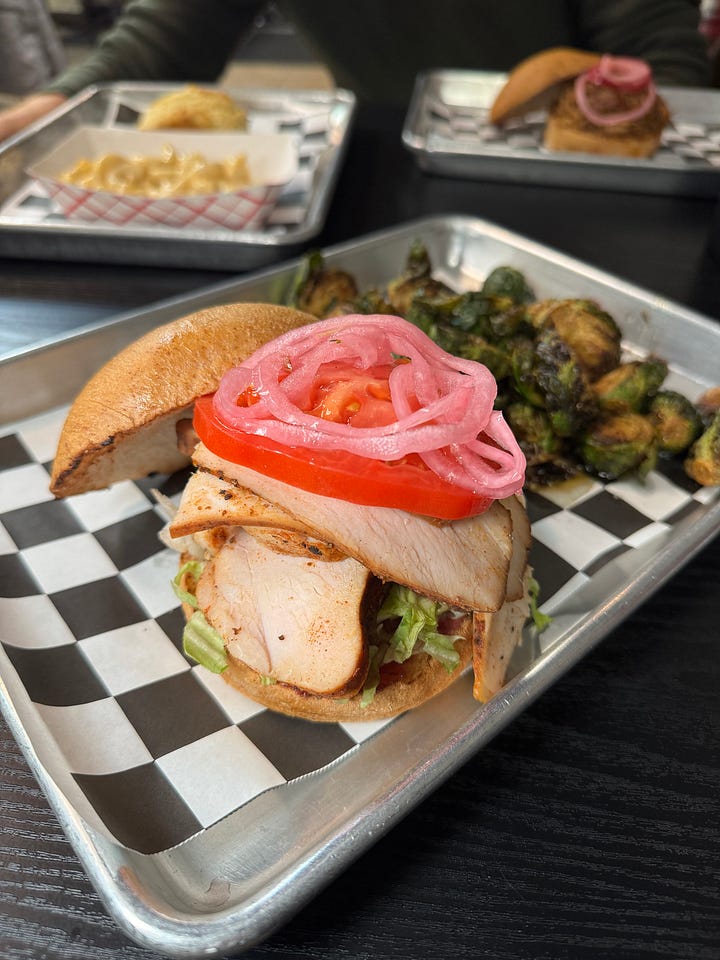 They’re already sold out of their signature Texas brisket and Memphis-style ribs this evening, so I promise him I’ll make it back in to try those before I write anything up. Meanwhile, we order a smoked turkey sandwich and side of delightful fried Brussels sprouts lightly glazed with maple syrup. The sandwich comes piled high with juicy meat, lettuce, tomato and pickled onions, and the GF bread’s good enough to not raise alarms as an alternative produced (as many GF items have textural or taste issues).
