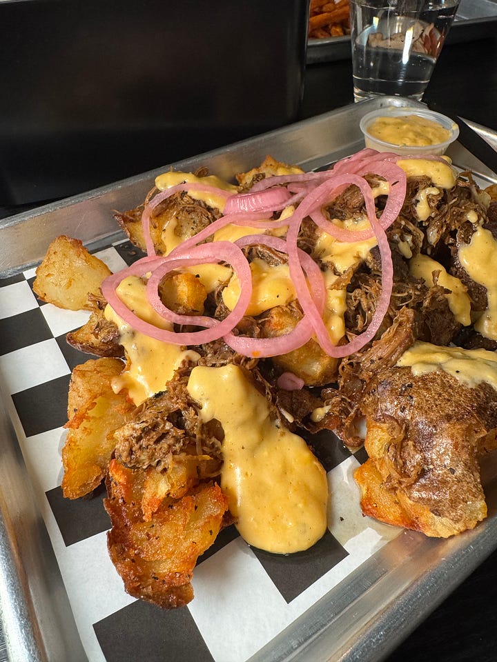 We also get the Pig Pile, which is smashed chunks of baked potato, deep fried and then seasoned with salt-, pepper- and garlic-laced, smoked tallow. On top comes succulent hickory-smoked pulled pork, a thick house cheese sauce and more pickled onions. It’s a symphony of rich, crispy-crunchy, creamy and smoky elements with the acidic offset of the sharp onions — overall a total comfort-food treat.