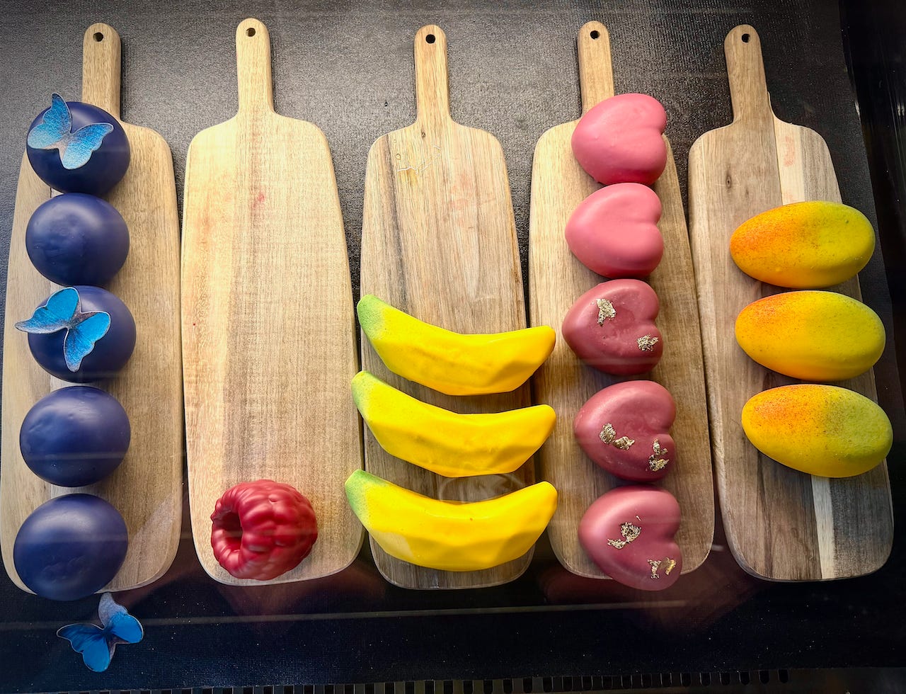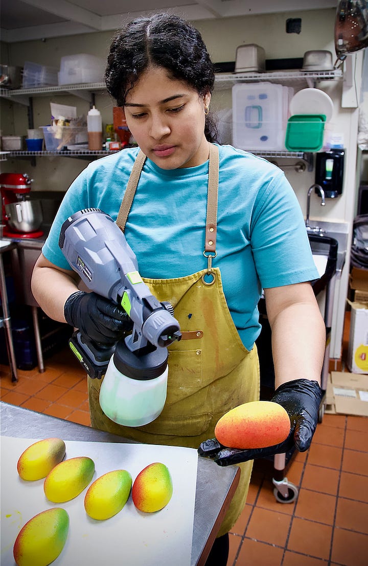 A bright green apple cake resembles the real fruit, for example, as do banana and raspberry cakes. A mango cake, dipped yellow and sprayed with red and green colors to mimic ripening, could be mistaken for the real thing at a glance. It’s all impressive pastry prowess.