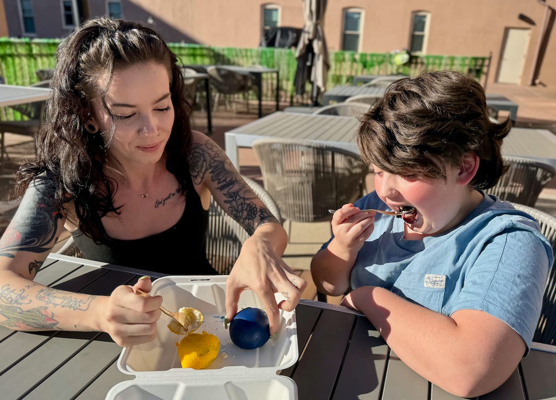 It starts before I reach the door, as I see a young woman and kid at a patio table happily devouring blueberry and lemon mousse cakes. A few minutes later while I’m snapping pics behind the scenes, I hear the phone ring and a staffer pick it up. After a pause to check inventory, he begins rattling off every flavor stocked at the moment. Not more than five minutes after that, I see a few people file in the front door and begin scanning the front pastry case excitedly. I chat with them, learning they’re down from Johnstown (near Loveland and Greeley, often a 2.5-hour drive), and they heard about the mousse cakes on … wait for it … TikTok. They depart with a full box.
