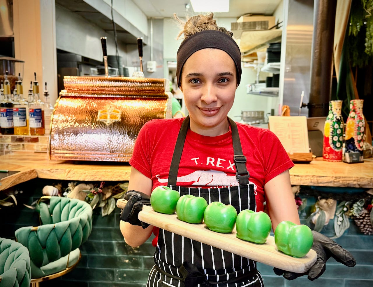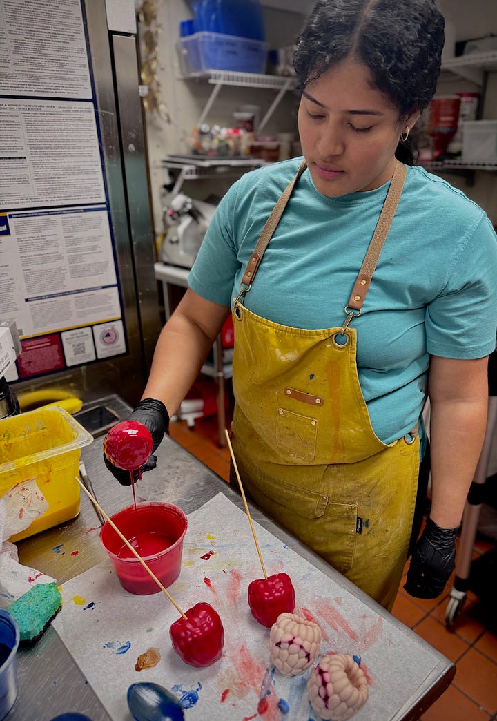 Okay, so that’s what was told to me. Then I drop by around opening time a week later to photograph pastry chefs Katherine Castro and her sister Lizzy Estrada as they’re dipping and painting the cakes — the final step of a three-day process to bring each one to life. Here’s what I witness:
