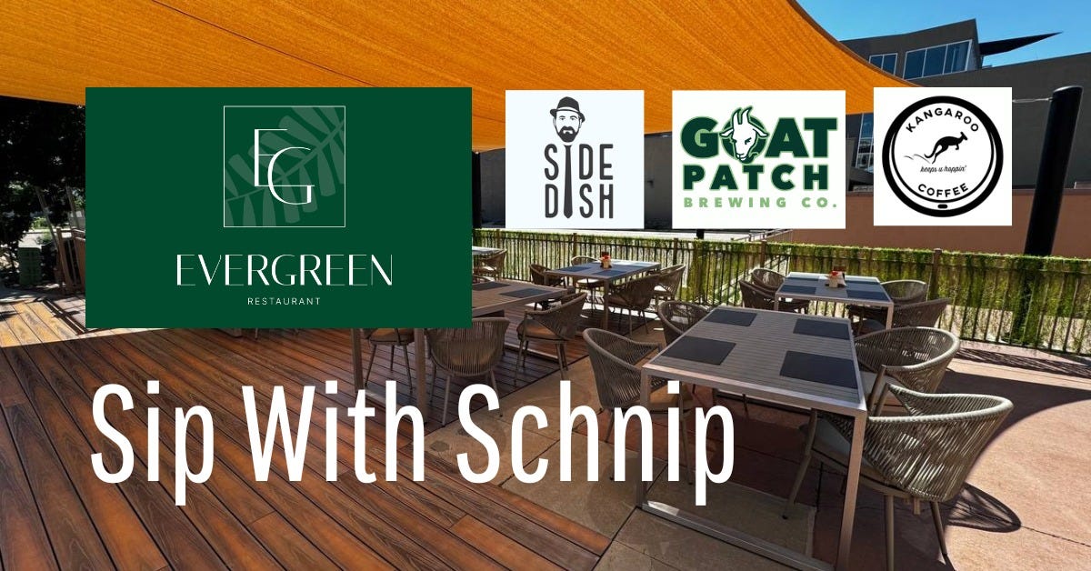 April 26: Patio Brunch Bash Sip with Schnip at Evergreen Restaurant. 10 a.m. to 2 p.m. $5 Goat Patch beers, bottomless mimosas, live music, pup-friendly patio plus a Breakfast Burger Special and one-day-only special Side Dish Mousse Cake, made with espresso from Kangaroo Coffee!