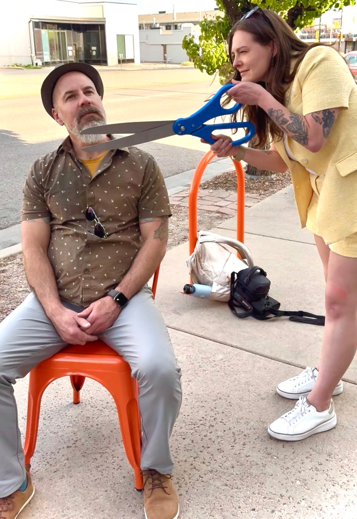 After Cinchona Coffee’s opening celebration earlier this week I convinced Downtown Colorado Springs’ Kelsee Swenn — my Weenies & ‘tinis partner in hot dog crime — to put the giant ribbon-cutting scissors to further good use. She gave me a rather expert beard trimming, enjoying it so much that she got an idea for a new business (she already operates Good Intentions): “Kelsee’s Kut + Kolor Kombos, Colorado Springs’ first open air sidewalk salon. Fresh fades, fresh air, quality you can trust.”
