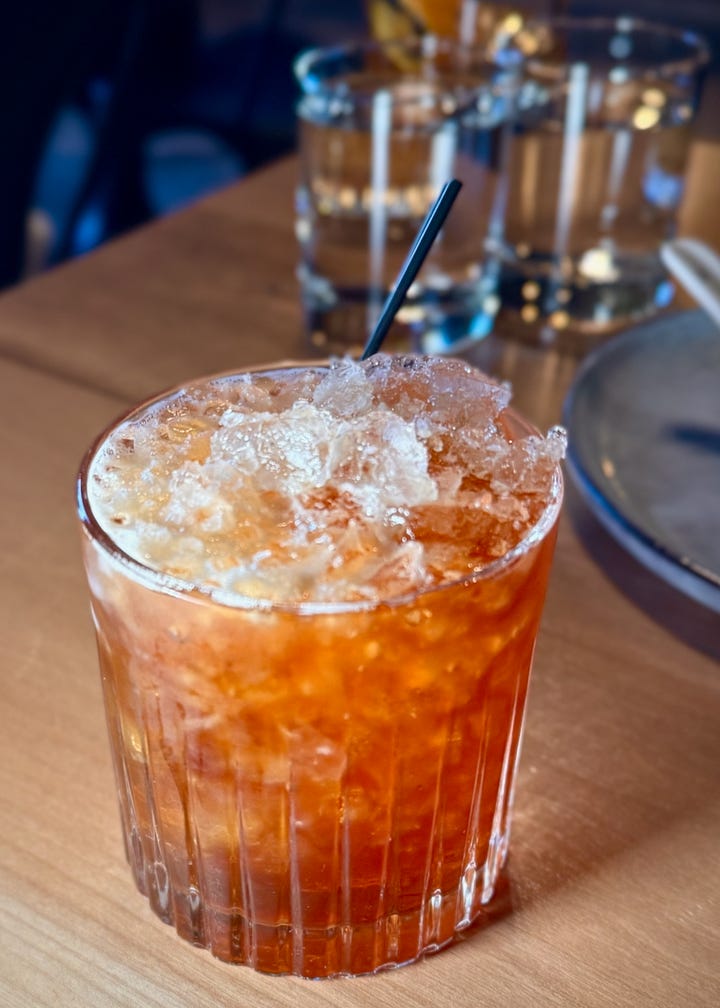 One drink, priced at $22, stands apart from the list. That’s the High Fashioned, an Old Fashioned riff made with Small Batch Calumet (a blend of eight and 15 year bourbons), orange flower maple, cardamom and black walnut bitters. We sipped it; whiskey aficionados should find it pretty outstanding.