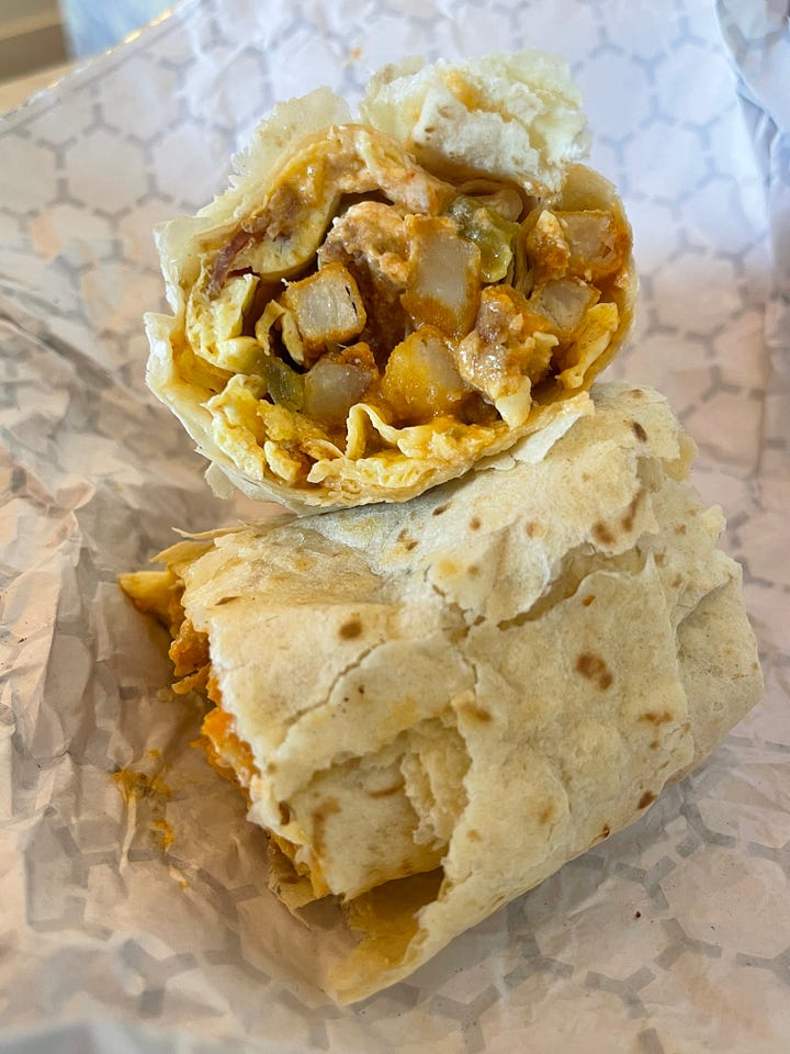 On a staff recommendation, I tried the all-day breakfast burrito with green chili. The chili adds a welcome kick, the potatoes have just the right bite, and even the tortilla’s got some character to it. But the crispy chicken lost its crunch when smothered with the other ingredients — grilled would probably be the way to go.