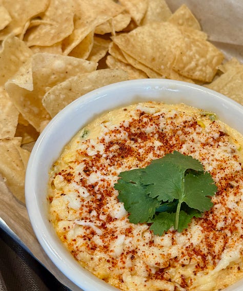 Next up: Elote dip with lime, cotija and tajin and tortilla chips. Absolutely kick-ass paired with the Dos Lunes Mexican Lager with a lime garnish.