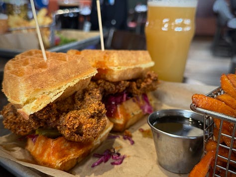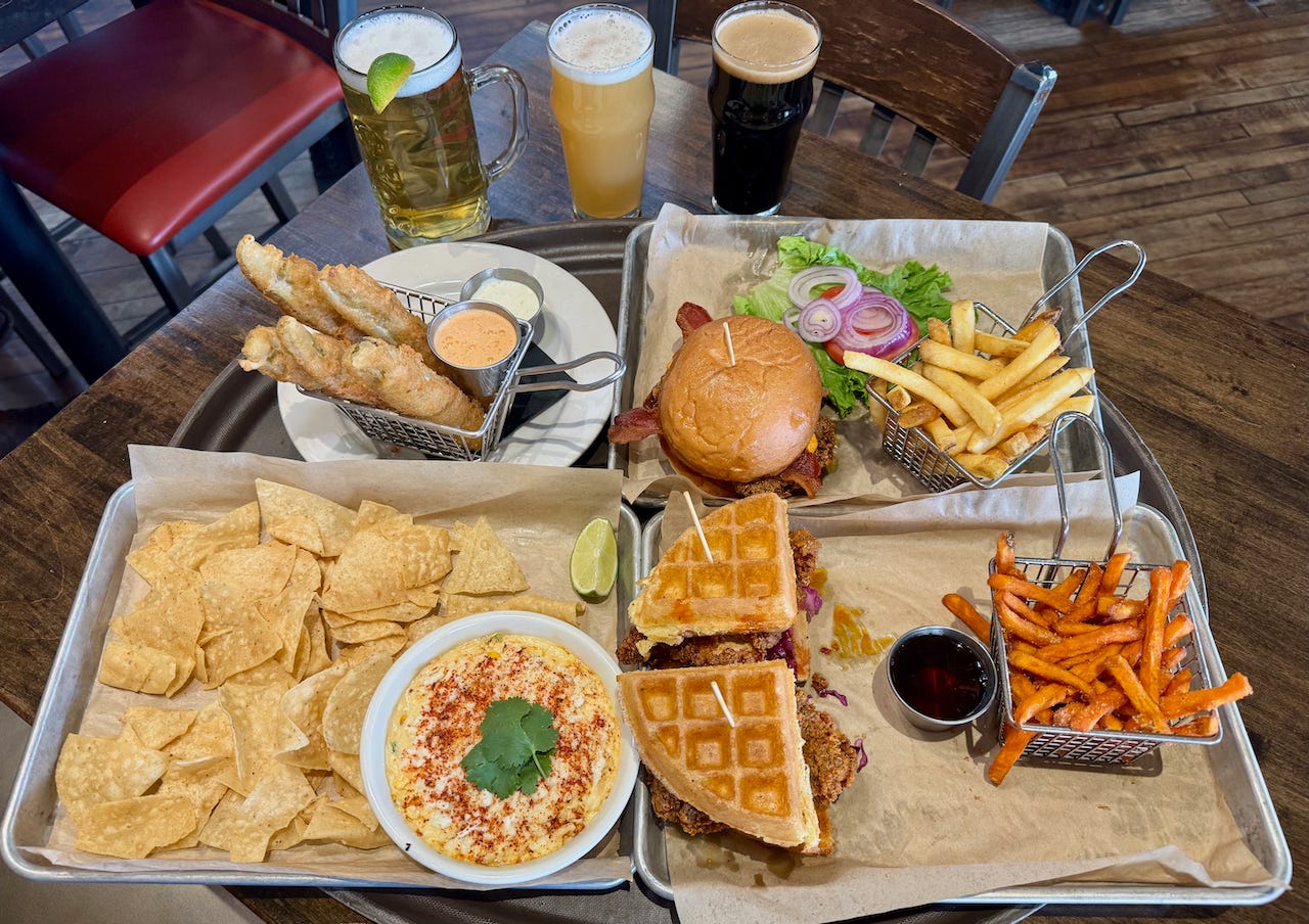 Before the spread arrived, I had already ordered a nitro-charged English Dark Milk beer named The Local (which was the silver medal winner at the 2026 Colorado Brewer’s Cup). It sips velvety and smooth at a sessionable 4.2 percent ABV and features toasty malt flavor and mild chocolatey-ness. It too pairs well with the chicken and waffles, accordingly, and is a pleasant meal finisher.