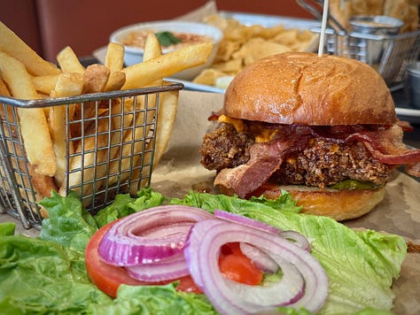 Item one: The buffalo sauce- and buttermilk-marinated Funky Chicken sandwich with pimento, bacon and Hefeweizen maple glaze. Hot damn! What a crunchy treat. Try it with the Puff Puff Give Hazy IPA.