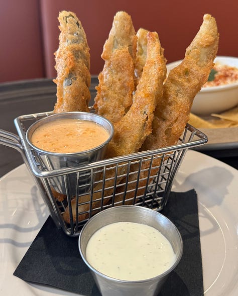 And lastly, Box Car red ale-battered spicy pickles with sriracha and ranch dips. Read: super beer-friendly, salty, acidic, tangy yum yums.