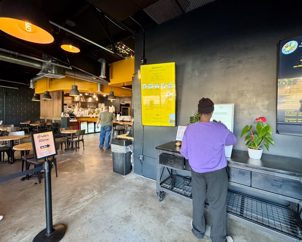 Texturally, the sandwiches are soft and spongy, and the bacon is left chewy vs. crispy, making us think of Korean pork belly. For the Salisbury steak, the sole sandwich to get a fried egg vs. scrambled (hence yolk down my hand), Nam seasons ground beef and pork with Korean spices and sauces like garlic and soy, and cooks it into a thin, hamburger-like patty. Both sandwiches are rich and filling (at $11.95 and $12.95 respectively). This is definitely morning or midday comfort food. (They’re currently open daily from 7:30 a.m. to 2:30 p.m., with plans to extend to 7 a.m. to 3 p.m. after grand opening celebrations on September 27.)