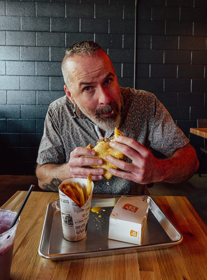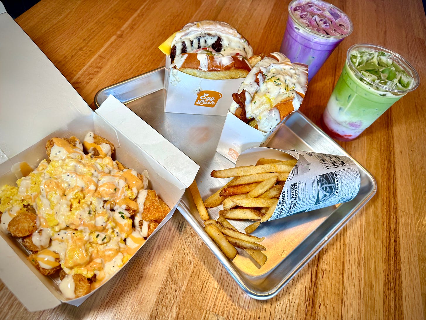 We order the bacon and cheese and Salisbury steak egg sandwiches, with side orders of fries and loaded Egg Lush tots, plus the strawberry matcha latte and ube matcha milk tea, and a house coffee. There’s also an avocado sandwich, as well as ham and cheese and more barebones Lush Classic. They all start with scrambled eggs inside the “buttery slow-fermented brioche” and are topped with house Lush mayo and spicy mayo. Hence the messy part; it’s impossible to keep it out of my beard when biting.