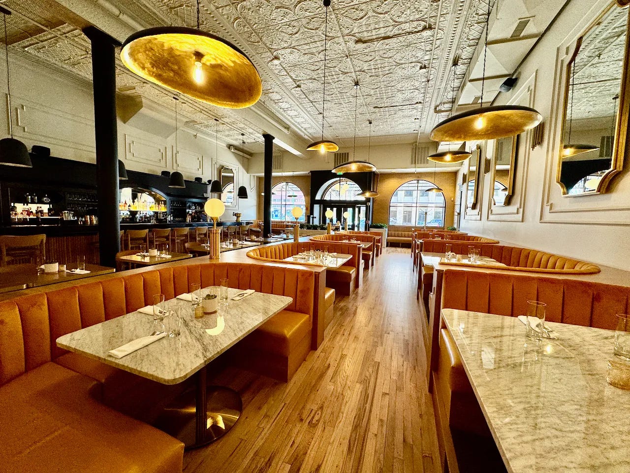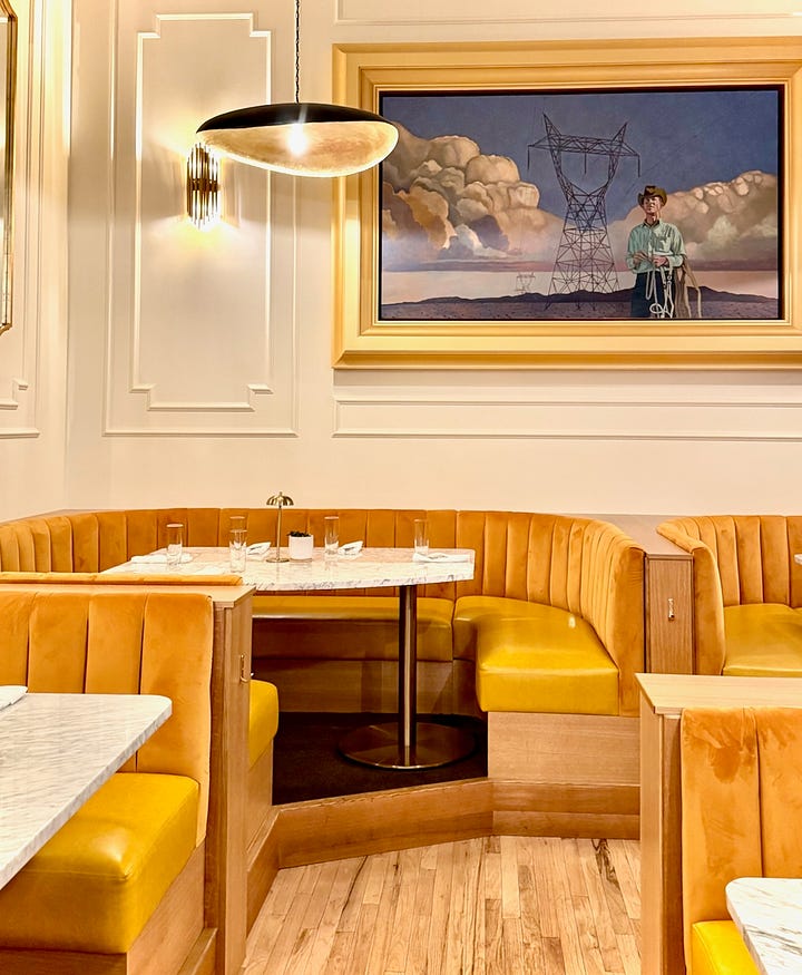 We bump into Buska on our way out and hear a little more from her, about inspiration for Oro derived from early Italian immigrants to the region. I can’t recall if she said it, or I just translated something else said, but I later find in my notes the phrase: “Tuscan sunset, but in Colorado.” Think of the name Golden Hour. Of warm lighting across the spaces, and striking Western art in Oro in particular, tying regional iconography into the layered story.