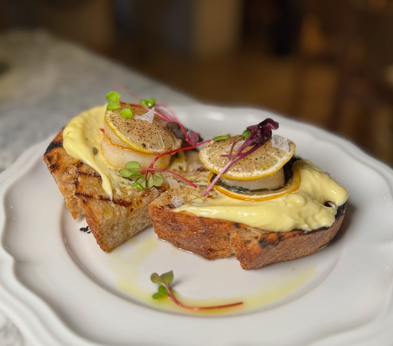 It starts to go awry with an absurd amount of garlic aioli (delicious on its own) spooned up into giant waves like in a Japanese painting. (Okay, now I’m being superlative, but you get the idea.) Then comes thin-cut lemon wheels with the rinds still attached, which will require you to pluck them from your mouth because they aren’t that pleasant to chew, despite the welcome pop of citrus they afford. Then the beautifully seared, double-stacked, soft scallops, again delightful on their own if they were presented as such. Add in some basil and microgreens and another touch of that Calabrian chili oil on-hand and again you can see the flavors in concept as working.