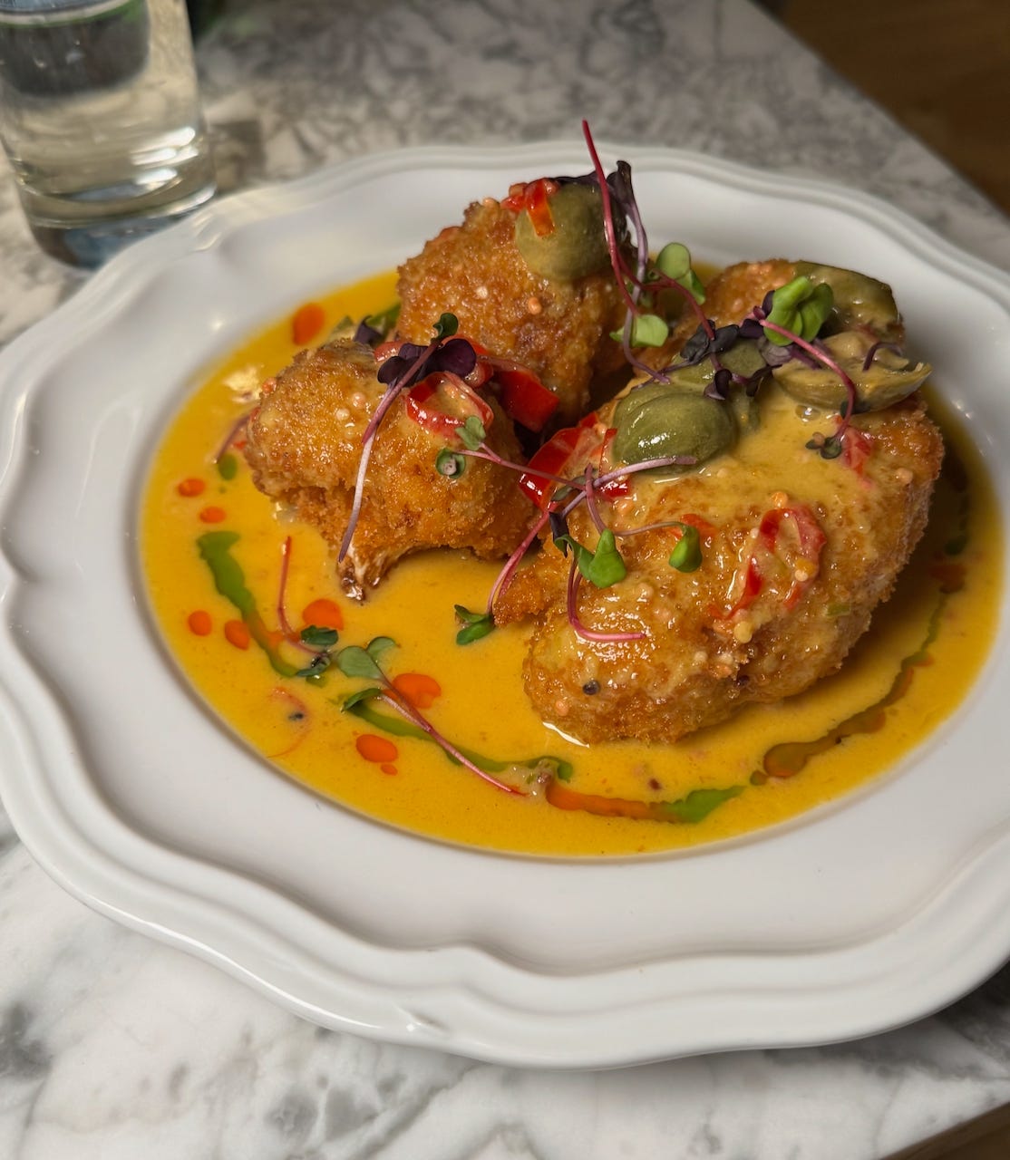 The item eats like a vegetarian steak in a way, thick and substantial. I’m not talking like a vegan lion’s mane mushroom steak; more like a fried chicken perhaps given the breading. That makes me think of chicken piccata as I write it, which makes sense with the sauce. So, now you see why it’s listed as a larger plate.