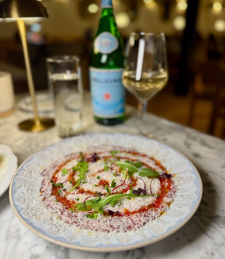 Backing up to the beginning of our meal, the antithesis to the bolognese, while still forwardly meaty, is the delicate and light bison carpaccio. Calabrian chili oil gives it a spicy pop, and a thick sprinkling of 24-month aged Parmesan lends saltiness and creaminess supported by the cured egg yolk component. Shaved hazelnut, chives, arugula and microgreens add color contrast and sharp vegetal notes. It’s highly enjoyable to eat.