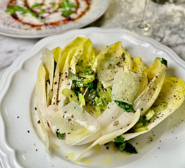 We nibble it alongside the ballsy Celery & Endive Alla Romana salad — and yes, I called a salad ballsy right there. ‘Cuz it is in this case. It offers a study in overlapping bitter and salty flavors, starting with the inherent endive and celery bitterness, but moving through salient bursts of caper saltiness and lightly fishy, garlic-anchovy vinaigrette. The anchovy component is actually Colatura di alici Italian fish sauce, and Puntarelle Alla Romana is a classic Roman salad. But since we don’t grow Puntarelle, an Italian chicory plant here, endive is the common substitution. (All this I just researched online; I don’t pretend to have known all that going in.)