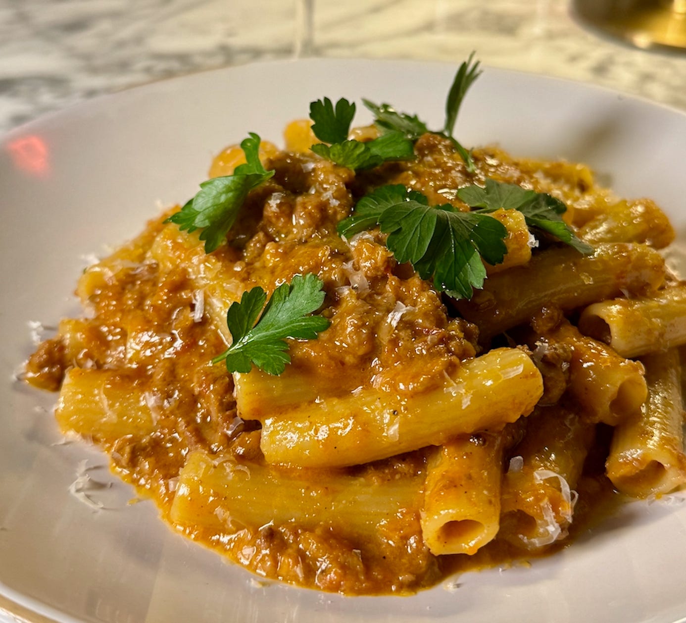 The result is a potently hearty pasta dish where you’re left tasting the layers of each meat rather than a tart, acidic tomato sauce. It’s a beefy pork, or um, porky beef — a little unctuous and soft with its ground texture. There’s a pop of lemon citrus and I pick out some very faint nutmeg in the finish, evoking a béchamel sauce in a way. As much as it is the targeted elevated comfort food dish, it’s also just a total WWE SmackDown! for your mouth in the culinary sense.