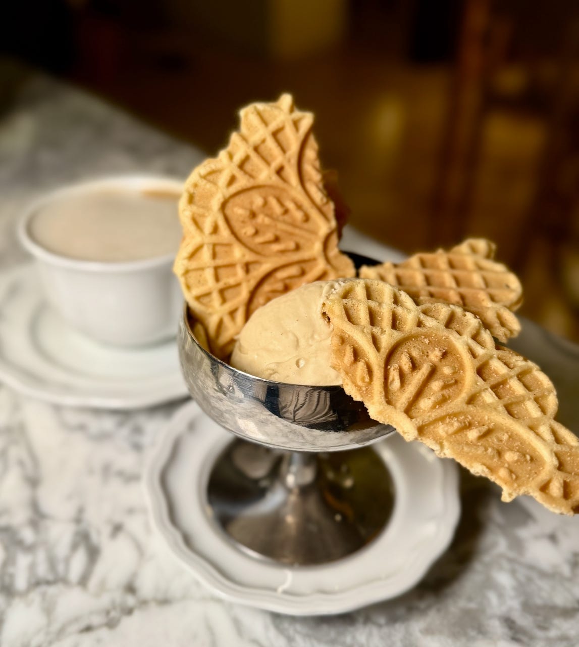 Our meal concludes with a shared cappuccino (from Hold Fast beans) and Italian pistachio gelato sourced through Denver’s Italco. It’s pleasantly not green from food coloring like too many synthetic pistachio ice creams, and isn’t over-sweet either. Chunks of decorative pizzelle Italian waffle cookies are suspended from the silver service cup like angel wings, making me think of some Italian Renaissance flourish.