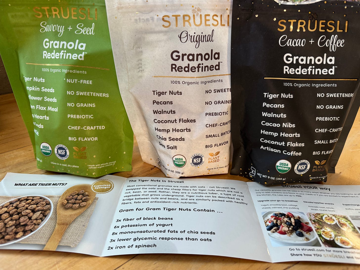 What I dig about the Original and Savory+Seed flavors is a finishing pop of sea salt that enhances other flavors. The OG benefits from coconut flakes and otherwise mixes tiger nuts, pecans, walnuts, hemp hearts and chia seeds. The Savory features tiger nuts with pumpkin and sunflower seeds, flax meal, hemp hearts and chia seeds. And my favorite, Cacao + Coffee, places the tiger nuts with pecans, walnuts, hemp hearts, coconut flakes, cacao nibs and ground coffee.