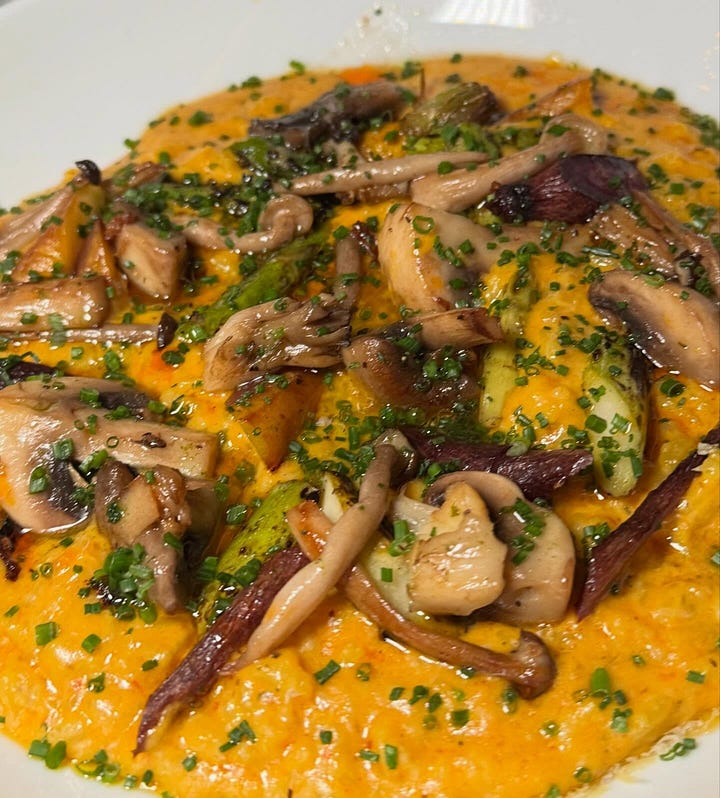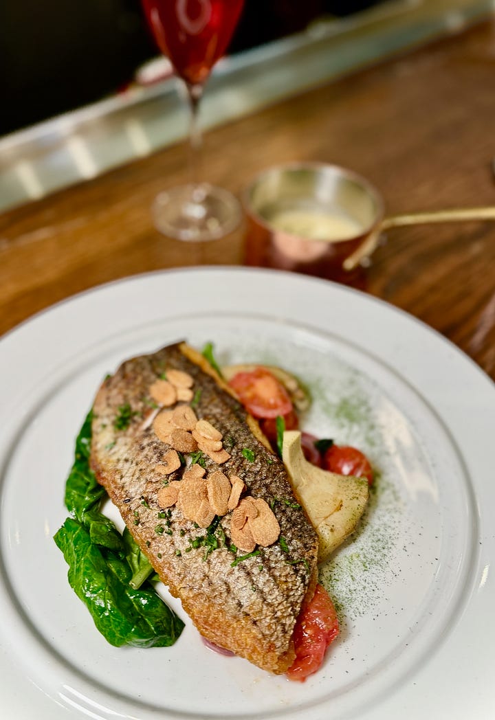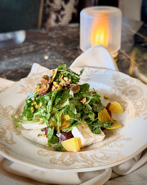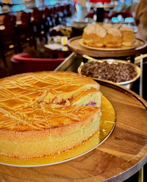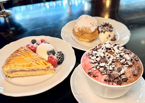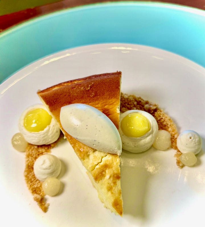 At the Penrose Room, my personal highlights were the vegetarian Agnolotti en Brodo starter of truffle pasta in a porcini mushroom broth (umami heaven); Beef Tip Bourguignon served with fingerling potatoes; and, well, all the desserts from the “dessert trolley experience,” featuring two mousse variants, a hazelnut Paris Brest and Gateau Basque Raspberry. But if I had to pick only one again, I’d likely save belly room for the Gateau Basque Raspberry, a lovely shortcrust cake filled with layers of vanilla pastry cream and raspberry marmalade.
