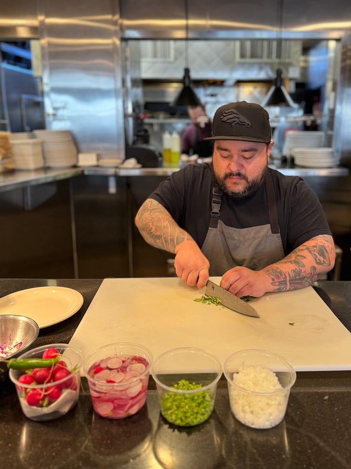 “This is my grandmother’s recipe, but I’ve been working on it for 15 years and tweaking it,” says Chef/Co-owner Mario Vasquez from Colorado Craft. “I make it at home a couple times a year. I find a lot of comfort in it. Some of my garnishes aren’t traditional, but they’re things I like. I don’t think it’s ever going to be perfect, or done.”