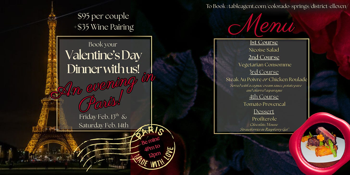 District Elleven: Book your Valentine’s Day dinner with us and enjoy An Evening in Paris (our theme). Five courses include Salade Niçoise, Steak Au Poivre, and chocolate mousse Profiterole for two. $95 per couple, $35 wine pairing. Serving Feb. 13 and 14.